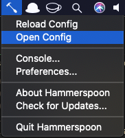 설정파일은 `~/.hammerspoon/init.lua` 경로에 위치해있습니다. 터미널로 직접 열 수도 있지만 `Open Config` 메뉴를 클릭하면 바로 열 수 있습니다. 참고로 `Console`을 선택하면 hammerspoon init이나 키 입력에 따른 결과값을 확인할 수 있습니다.